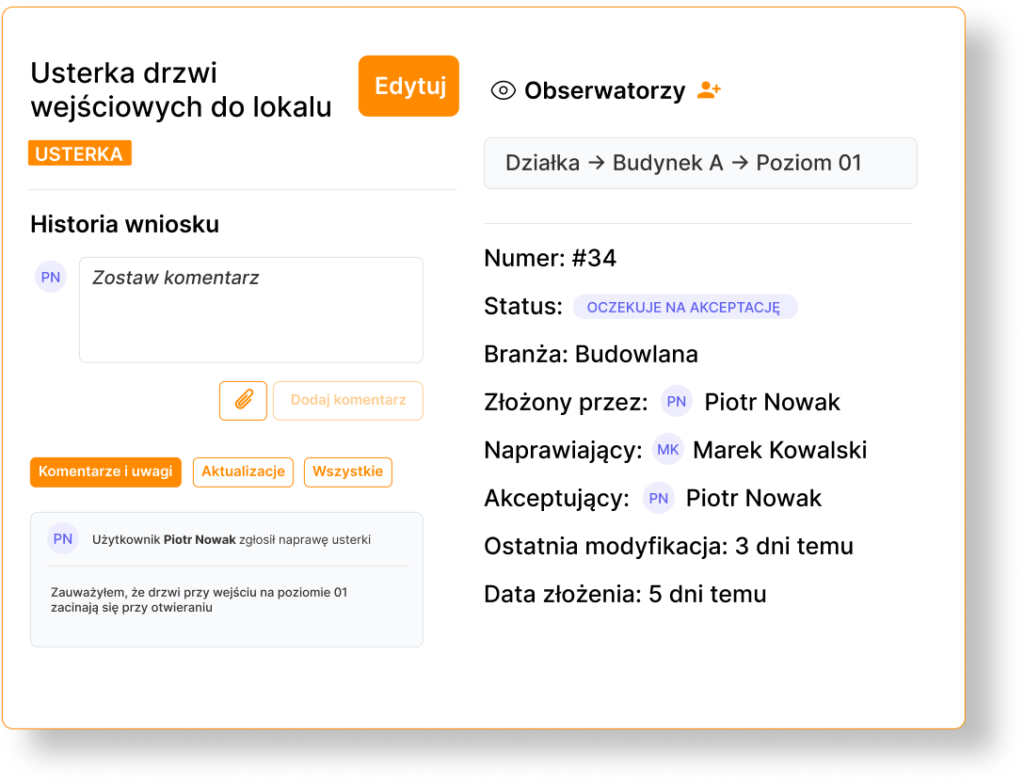 Tak. Każda usterka ma jednego właściciela, jasny status i pełną historię komunikacji w jednym miejscu. Zespół pracuje na tych samych, aktualnych danych, a Ty masz dowód realizacji gotowy na odbiory — bez przekopywania się przez archiwa mailowe.